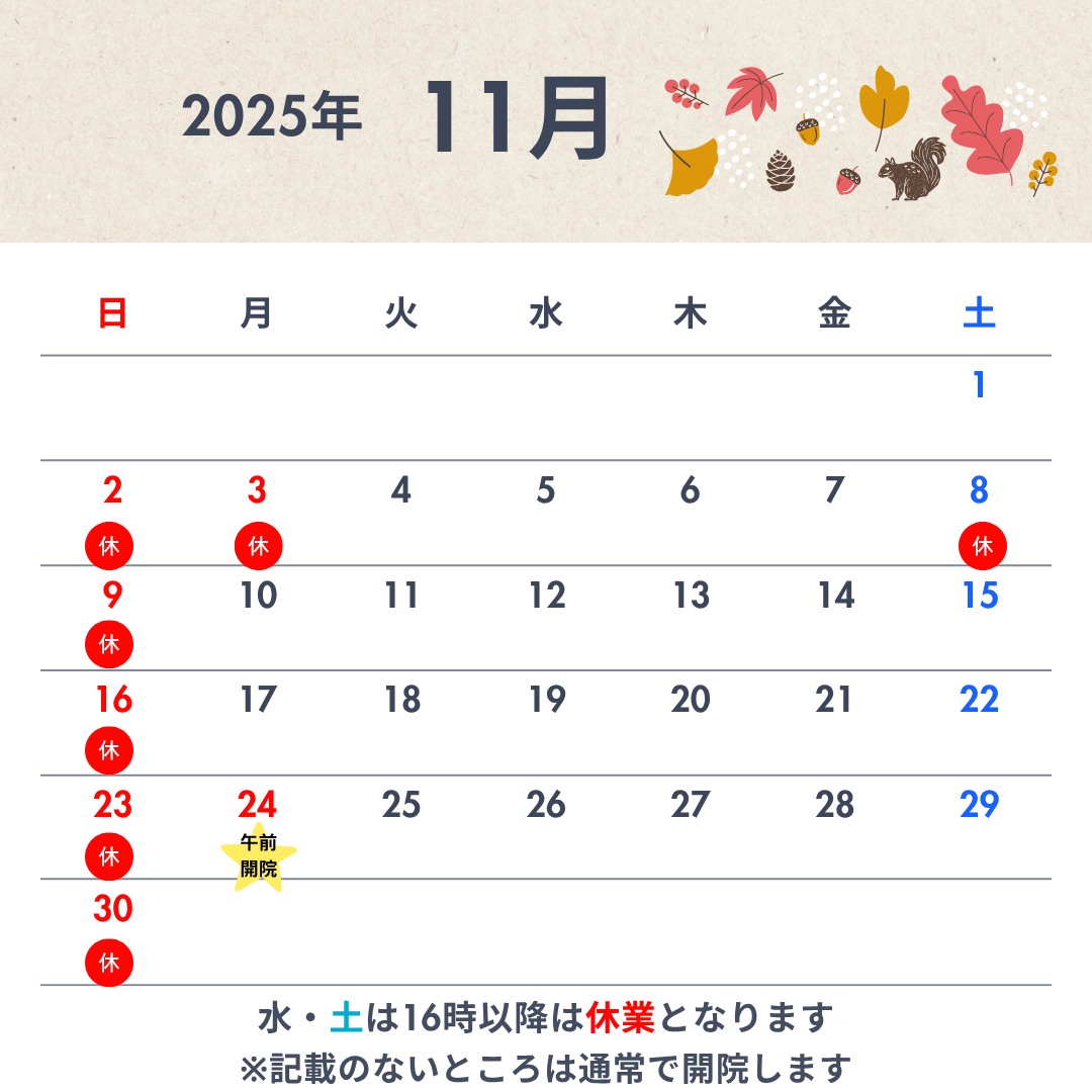 11月24日(振り替え休日) 午前のみ開院いたします。